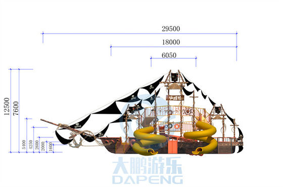 Alle glijbanen zijn ook gemaakt van glasvezel. Uitgerust met piratenschip elementen, zoals waterkanon, piraten, piratenvlag, etc.